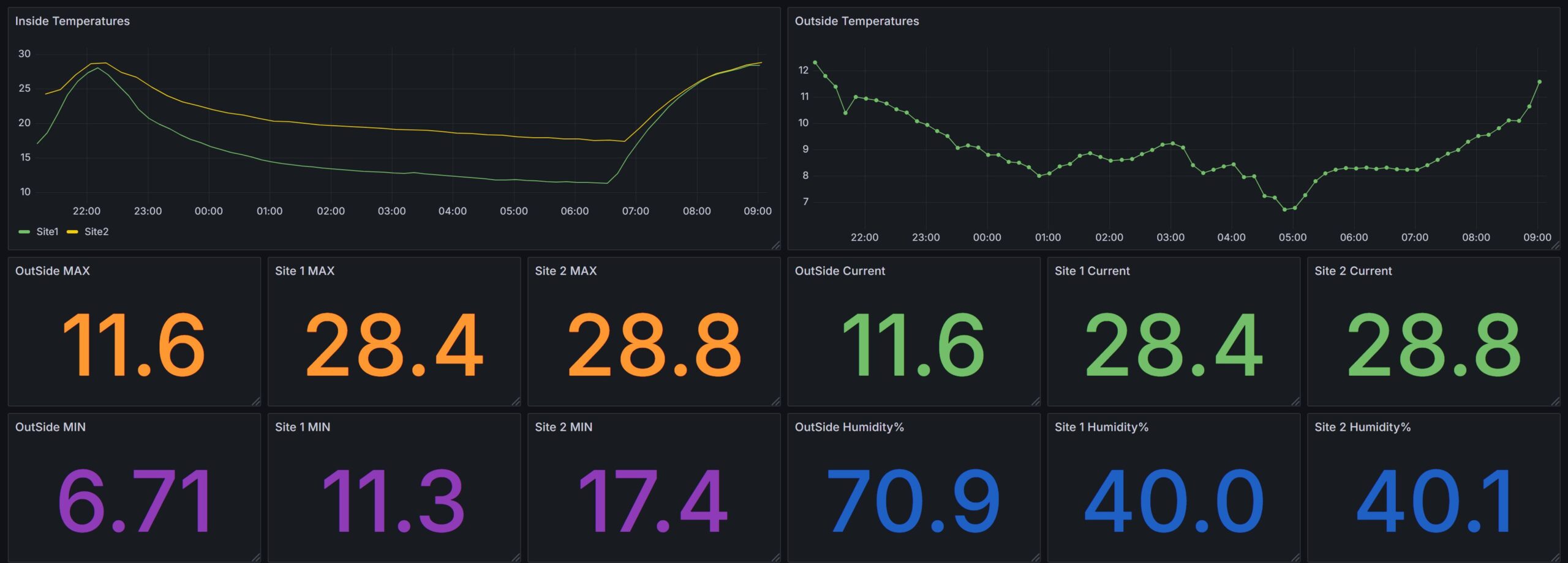 In deze gerealiseerde opstelling monitoren we 24/7 de temperatuur en vochtigheid op verschillende locaties op de site van onze klant, waarbij we de data lokaal verzamelen met sensoren gekoppeld in een apart WiFi netwerk. We hebben er samen voor gekozen om elke sensor zijn gegevens elke 10 minuten via een centrale 4G verbinding aan de zelf gehoste InfluxDB en Grafana omgeving te laten doorgeven.